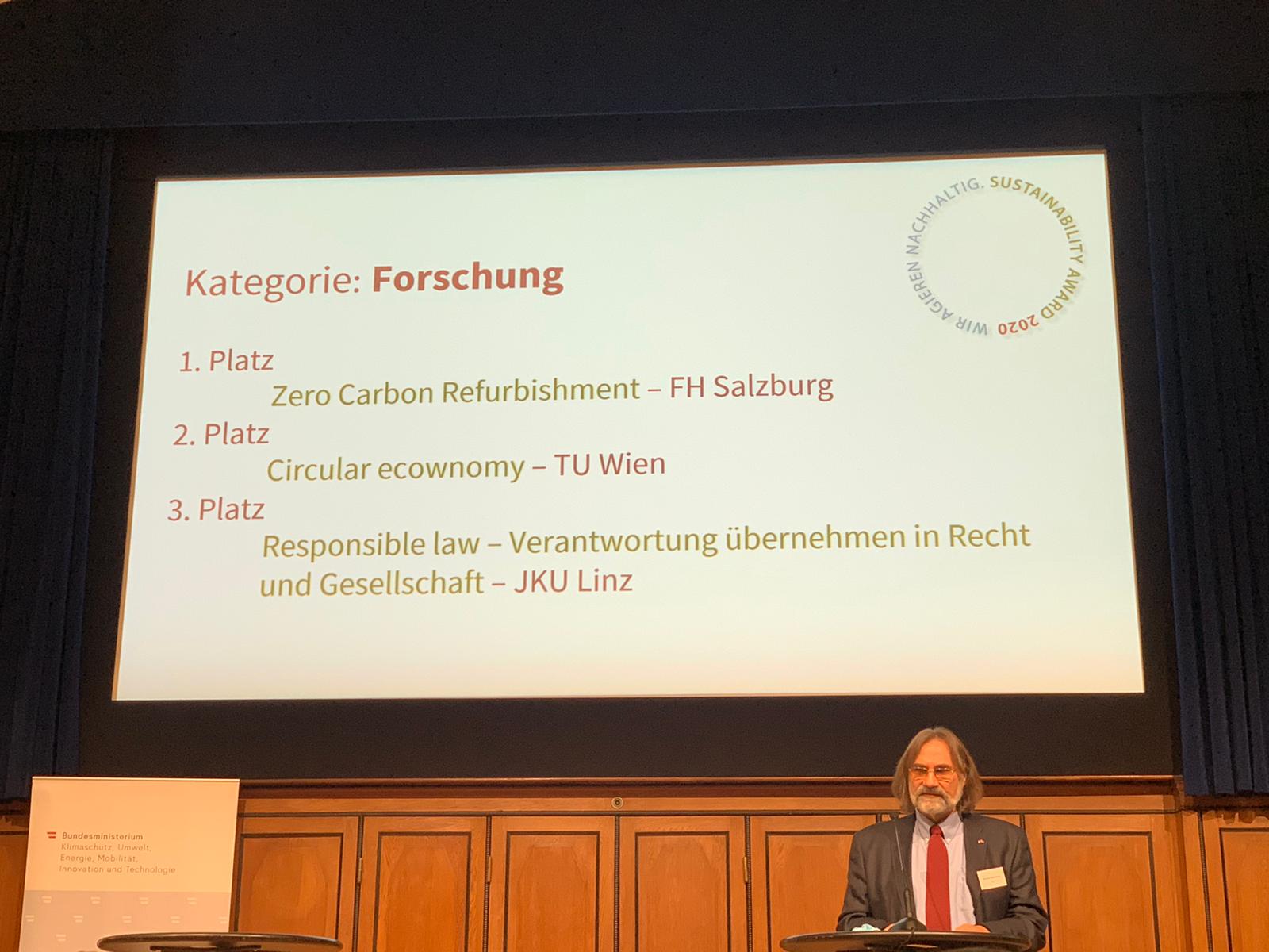 Das Forschungsteam am FH-Salzburg Studiengang Smart Building hat doppelten Grund zur Freude. Am 2.11. wurden zwei Projekte wurden mit dem Sustainability Award 2020 ausgezeichnet: das Projekt „Zero Carbon Refurbishment (ZeCaRe II)“ und das Projekt „Wohnen findet Stadt - Smart City Hallein“. Der Sustainability Award, der als gemeinsame Initiative des Ministeriums für Bildung, Wissenschaft und Forschung und des Ministeriums für Nachhaltigkeit und Tourismus ins Leben gerufen wurde und vom FORUM Umweltbildung abgewickelt wird, wird alle zwei Jahre vergeben. Am Wettbewerb teilnehmen können alle öffentlichen Universitäten Fachhochschulen, private akkreditierte Universitäten und pädagogische Hochschulen Österreichs.