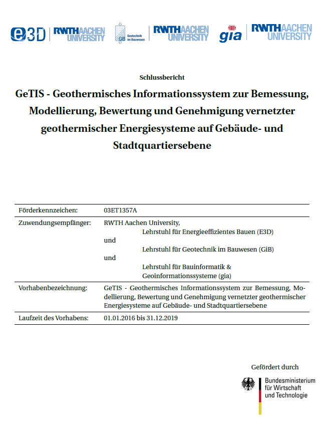Nach einer erfolgreichen Zusammenarbeit der Projektpartner innerhalb der RWTH Aachen ist der Schlussbericht des Verbundvorhabens GeTIS - Geothermisches Informationssystem zur Bemessung, Modellierung, Bewertung und Genehmigung vernetzter geothermischer Energiesysteme auf Gebäude- und Stadtquartiersebene (FKZ: 03ET1357A) nun veröffentlicht. Dieser ist unter folgender Adresse frei zugänglich: https://www.tib.eu/de/suchen/id/TIBKAT:1738225658 (DOI: 10.2314/KXP:1738225658)