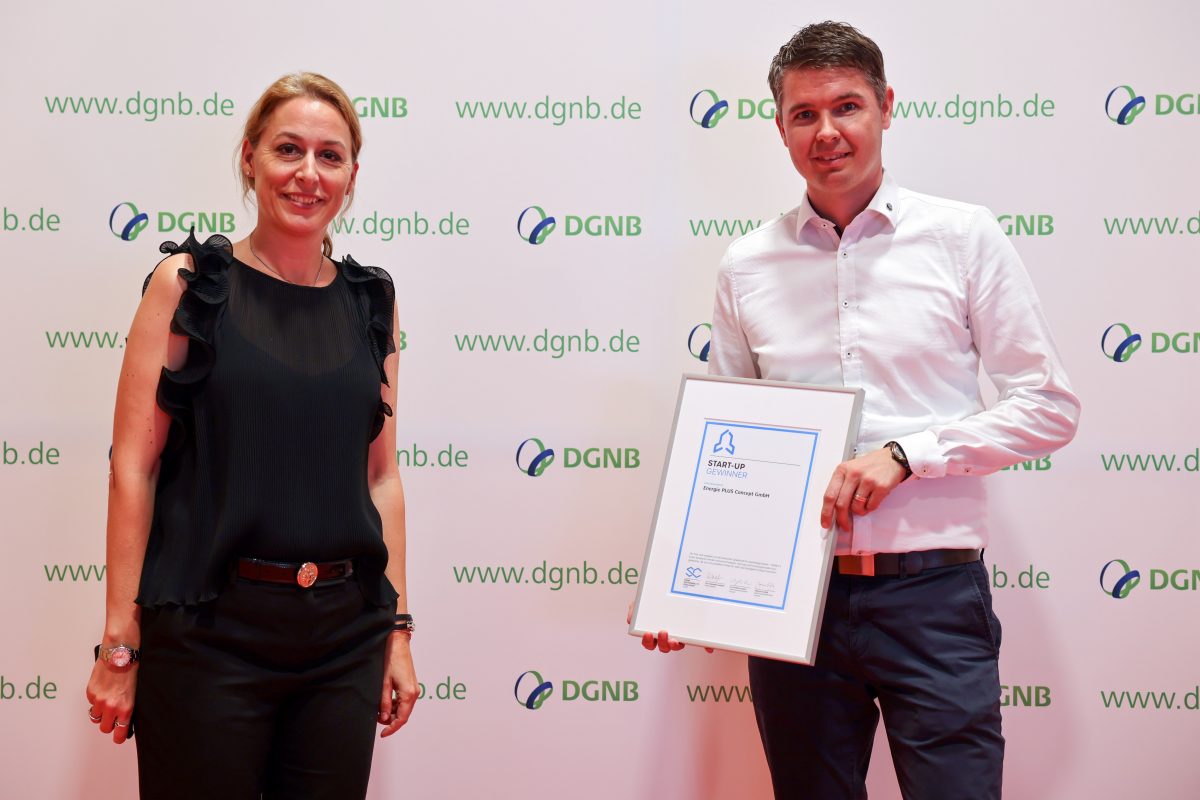 Die Energie PLUS Concept hat sich bei der diesjährigen Sustainability Challenge 2020 der Deutschen Gesellschaft für nachhaltiges Bauen (DGNB) beworben und ist bei insgesamt 80 Bewerbern unter die drei Finalisten in der Kategorie Start-Up gekommen. Nach einem Online-Pitch und einem Online-Voting konnte sich die Energie PLUS Concept gegen die Mitfinalisten durchsetzen. Die Preisverleihung fand am 21.09.2020 im Rahmen des DGNB Tag der Nachhaltigkeit im Hospitalhof in Stuttgart statt . Im Bild übergibt Dr. Christine Lemaitre (Geschäftsführender Vorstand DGNB e.V.) die Urkunde an Prof. Dr.-Ing. Volker Stockinger. Neben 200 Vor-Ort-Besuchern konnten viel Interessierten den Tag im Livestream mit verfolgen.