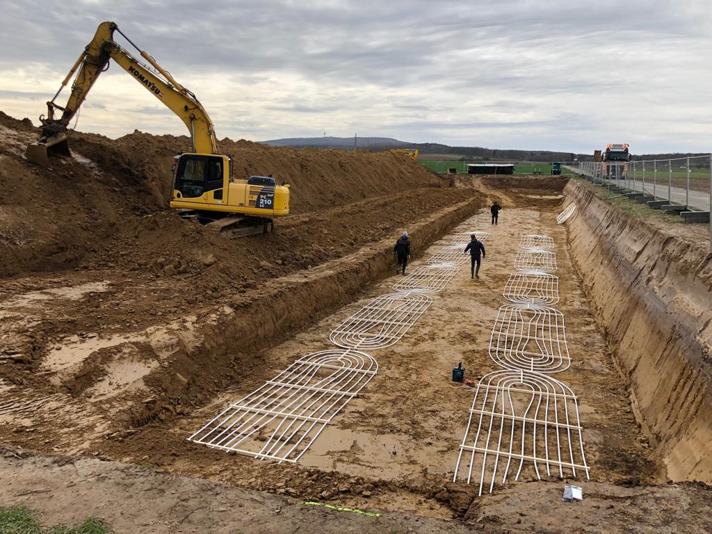 In Zusammenarbeit mit der Bayerischen Verwaltung für Ländliche Entwicklung (Bereich Zentrale Aufgaben) und der FAU Erlangen wird bei unserem Projektpartner Erdbau Leicht in Schmerldorf (Bayern) ein geothermisches Test- und Demonstrationsfeld mit diversen oberflächennahsten Geothermiesystemen errichtet. Ziel ist unter anderem, den Einbau der verschiedenen Kollektorarten zu dokumentieren und die Anlagen wechselseitig über eine in einem Bürocontainer eingebrachte Wärmepumpe zu beheizen bzw. zu kühlen. Unser Dank gilt den folgenden spendenden Unternehmen, deren Produkte gerade vor-Ort eingebaut werden:
